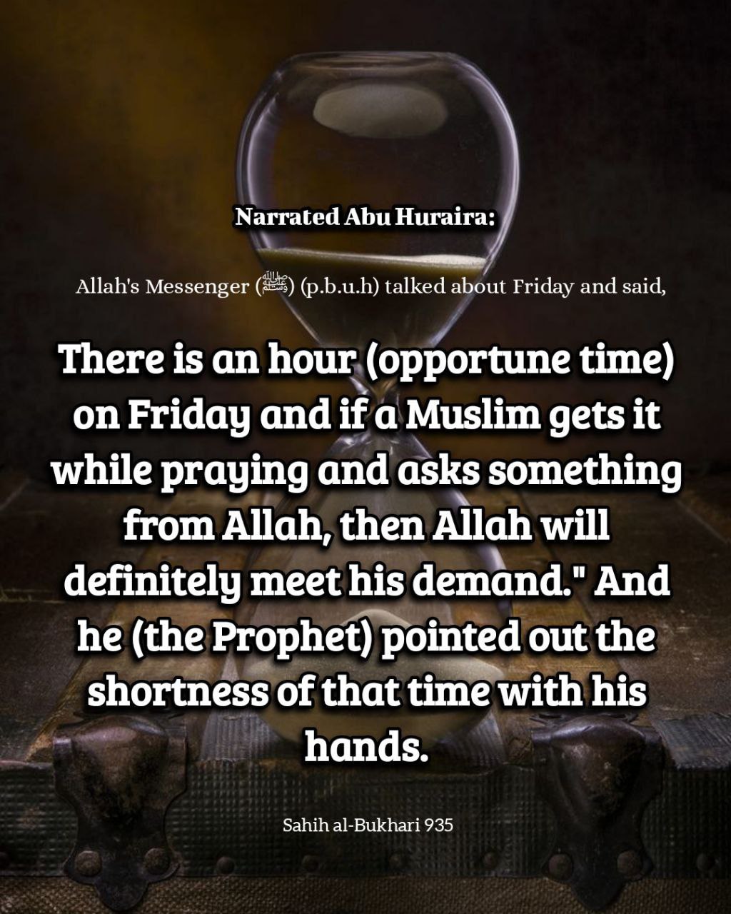Allah’s Messenger (๏ทบ) talked about Friday and said, “There is an hour (opportune time) on Friday and if a Muslim gets it while praying and asks something from Allah, then Allah will definitely meet his demand.” And he (the Prophet) pointed out the shortness of that time with his hands.